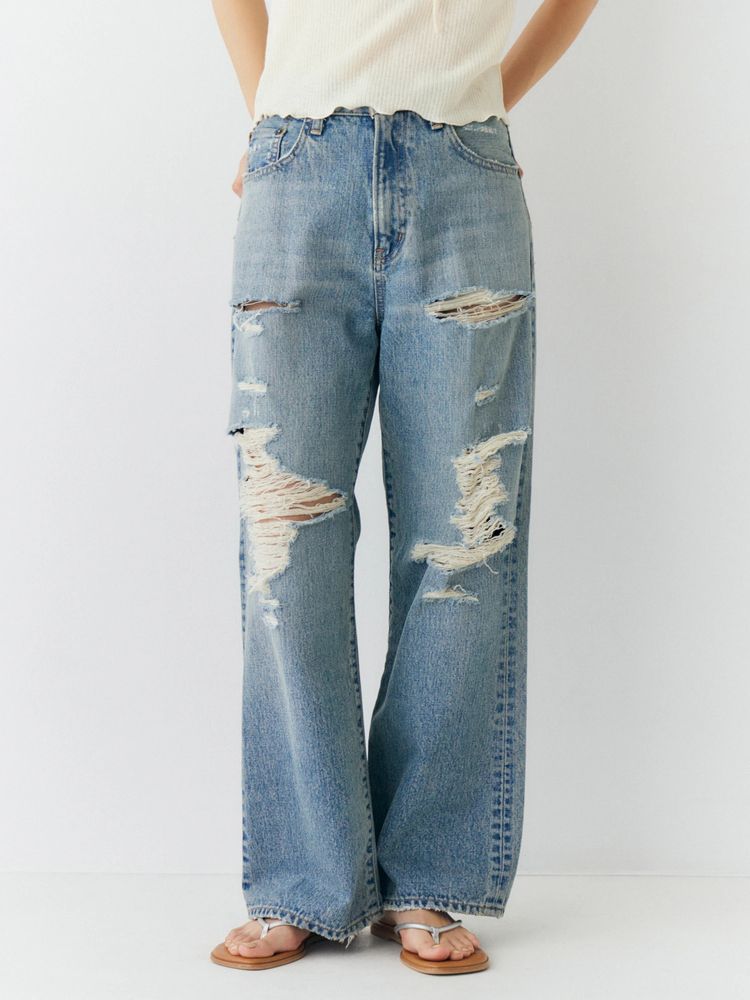 大胆なクラッシュを施したストレートデニム