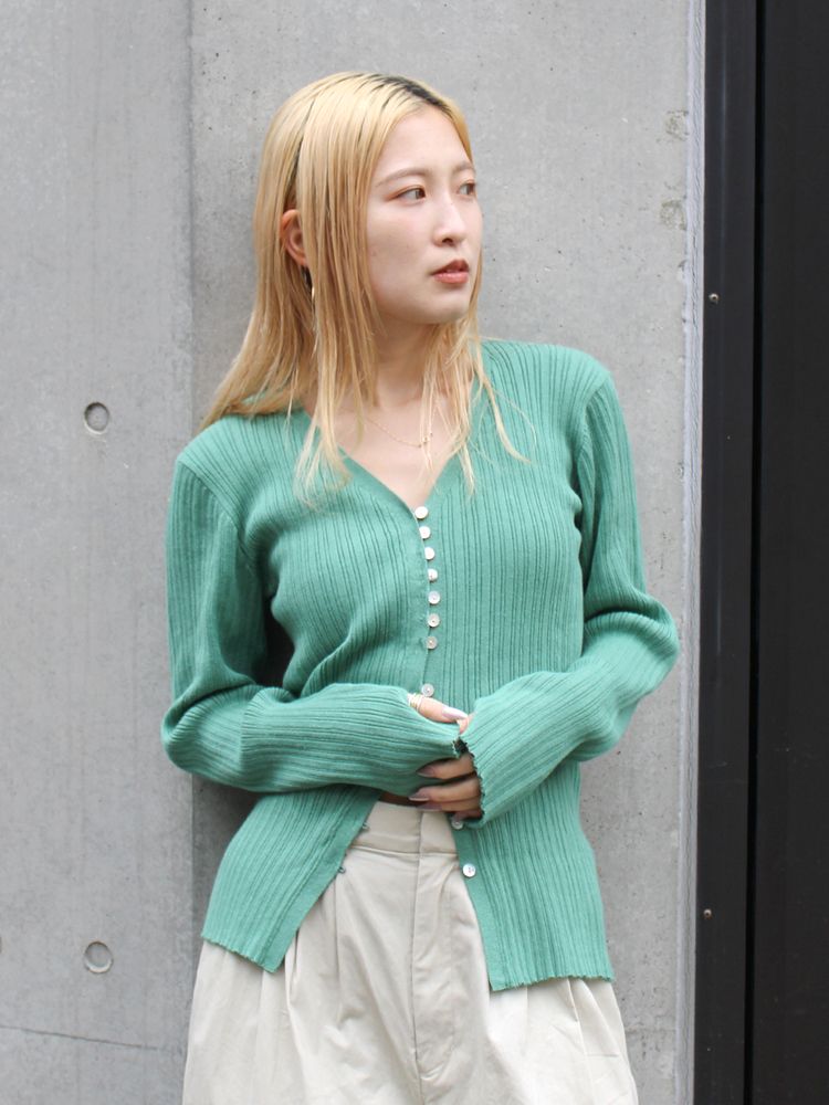 深めのVネックで、女性らしい抜け感を演出。中心のボタンは留め、下は開くように着用するのがおすすめ。