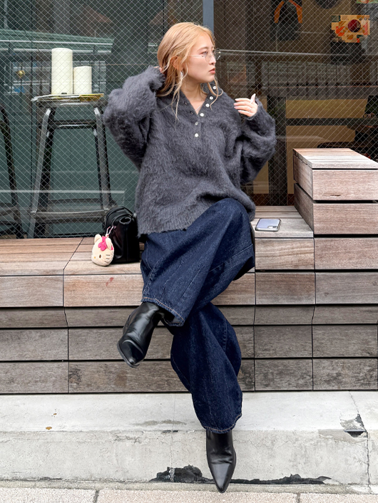 ボートネックなので少しドロップしてオフショルダーでも着れるので自然な抜け感とこなれた印象を演出。