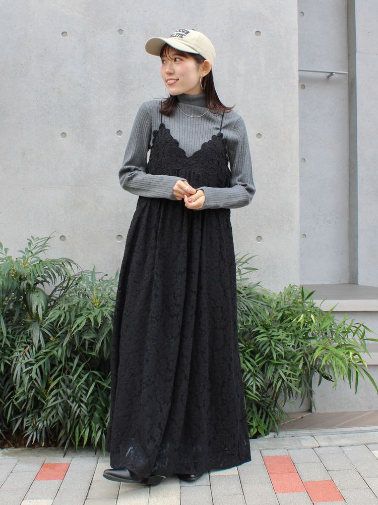 胸元にバテンレース、スカート部分に起毛レース生地を使用した、異素材コンビのデザインワンピース