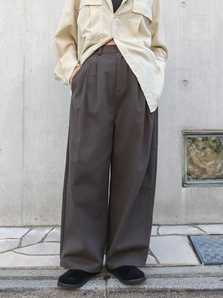 ワイドシルエットですが、ウエストのタックと膝のダーツが立体感のあるボリューム感を演出。