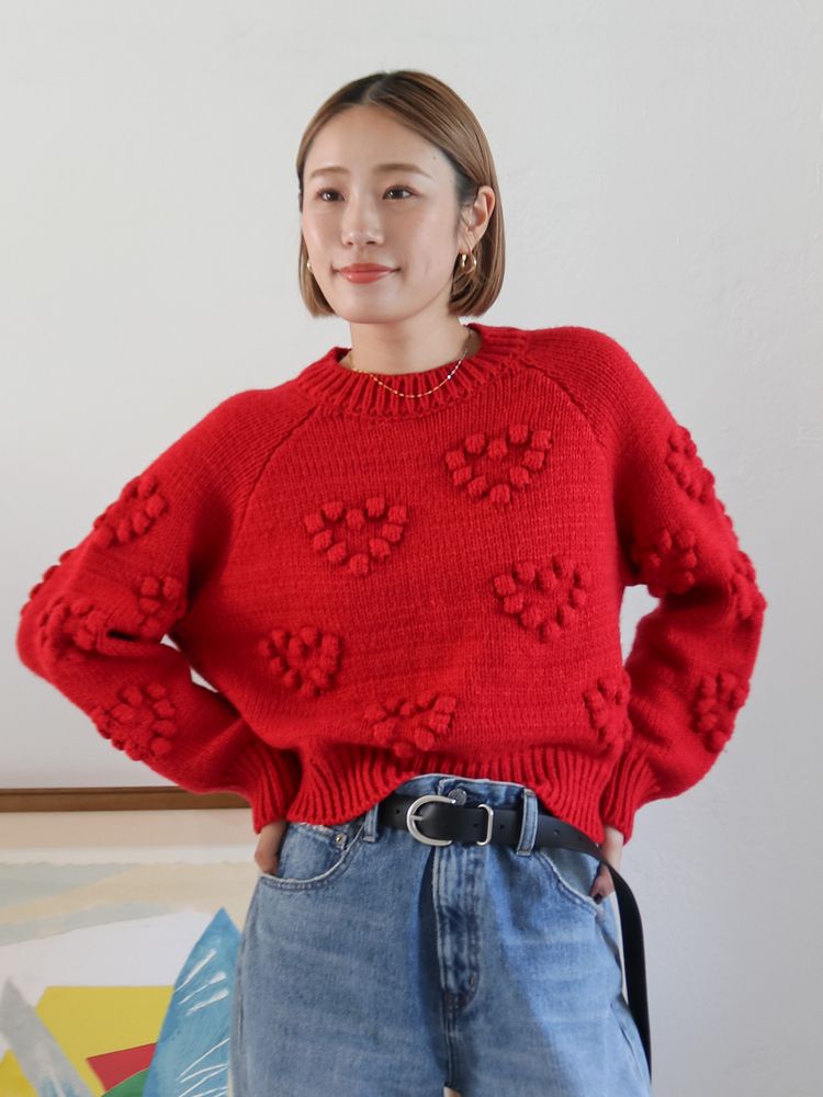 ぽこぽことしたハート柄がWEB限定ならではのキャッチーなクルーネックニット