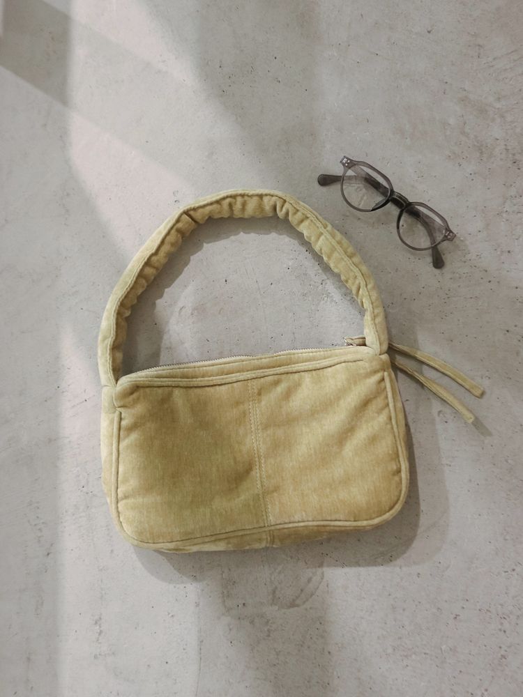 ベロア生地を使用した、スクエア型が今っぽいハンドバッグ。