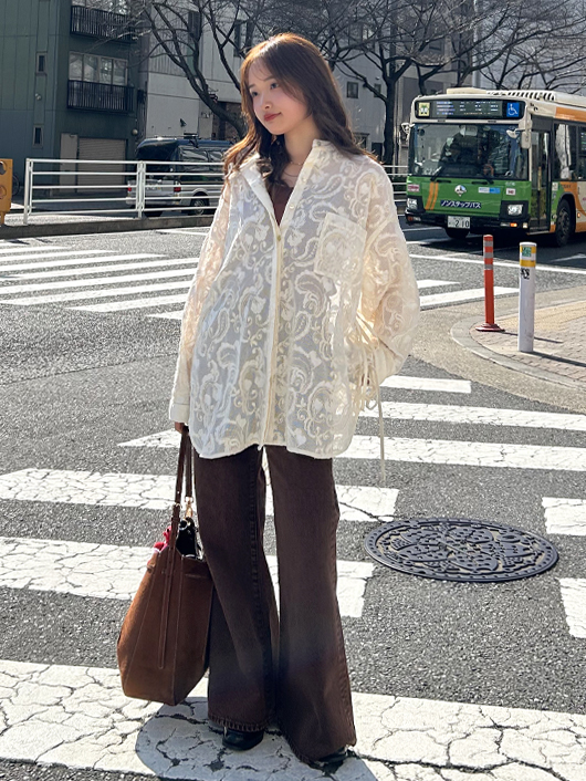 薄手のシアー感とカラーリングがポイントで、重ねて着るスタイリングもおすすめです。