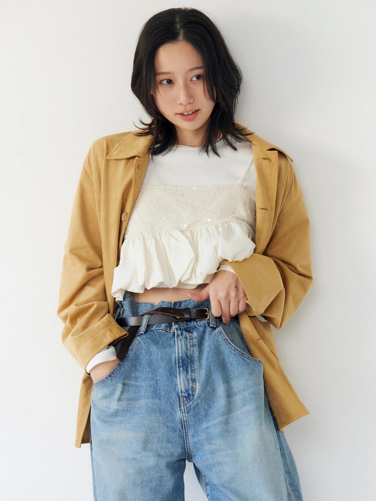 ビッグサイジングのデニムをベルトでぎゅっと締めてメンズライクなシルエットで履けるデザインデニム
