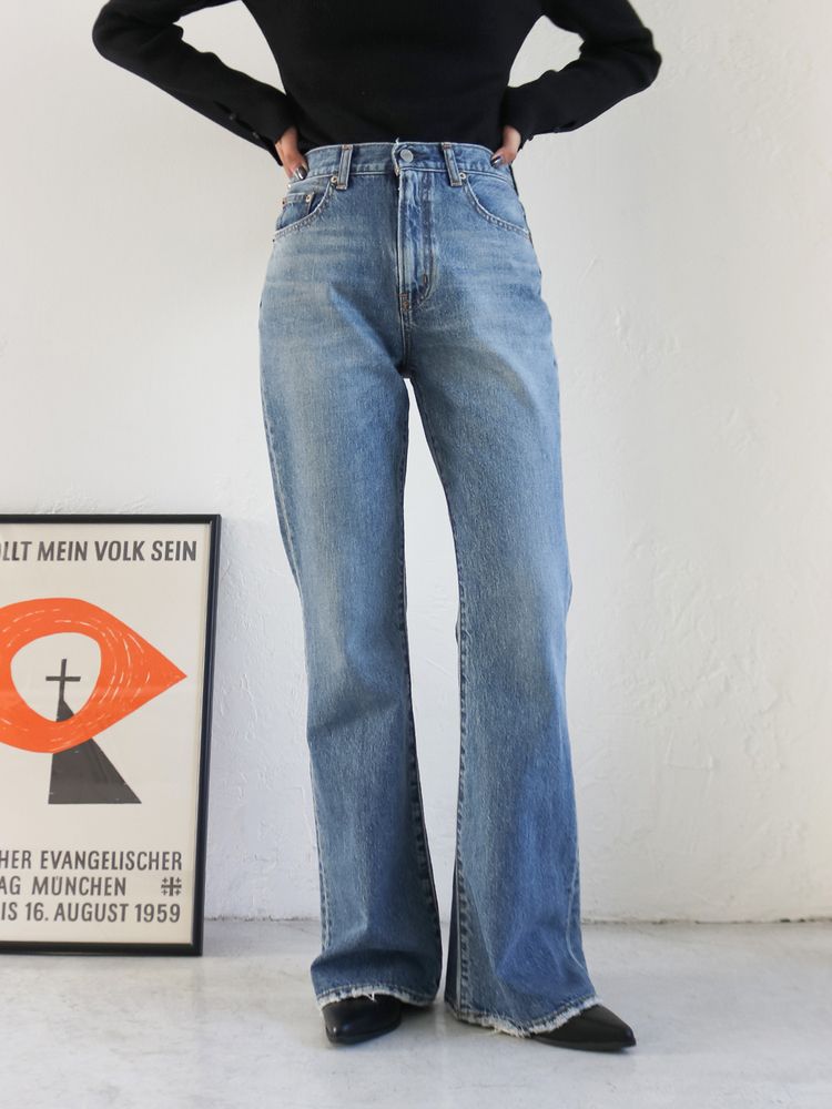 ふともも部分はすっきりとしたシルエットで、フレアになる部分を上にする事で脚が長く見えるデニムです。