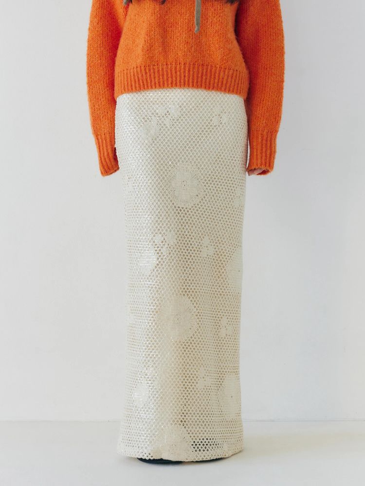 スパンコールが散りばめられた透かし編み生地がぱっと映えるスカート