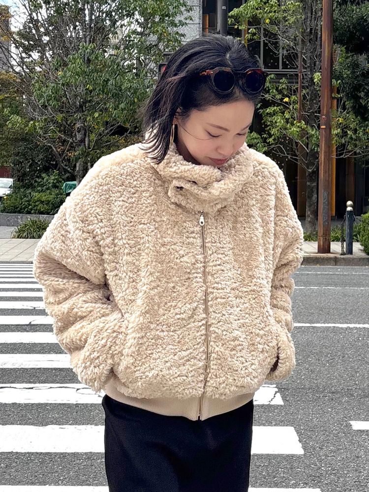 丸みのおびたコクーンシルエットと、モコモコとしたボアの素材が存在感のあるブルゾン
