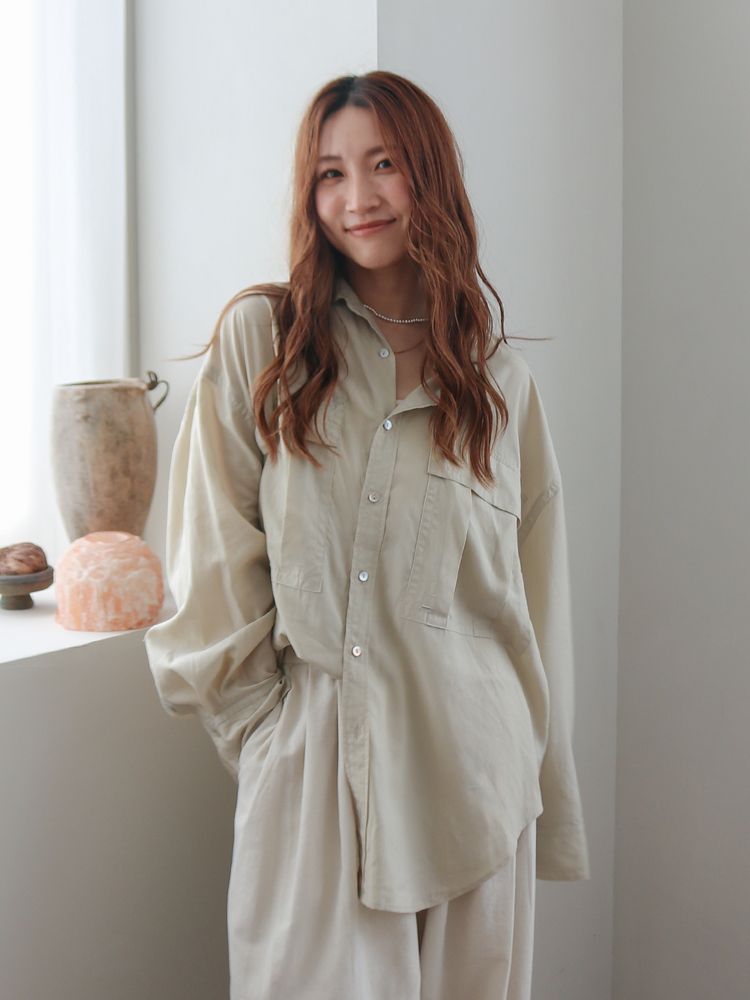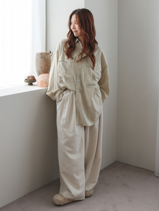 太めでルーズなサイズ感ですが、落ち感のある生地を使用しているので野暮ったく見えず、こなれて見えるシルエットです。