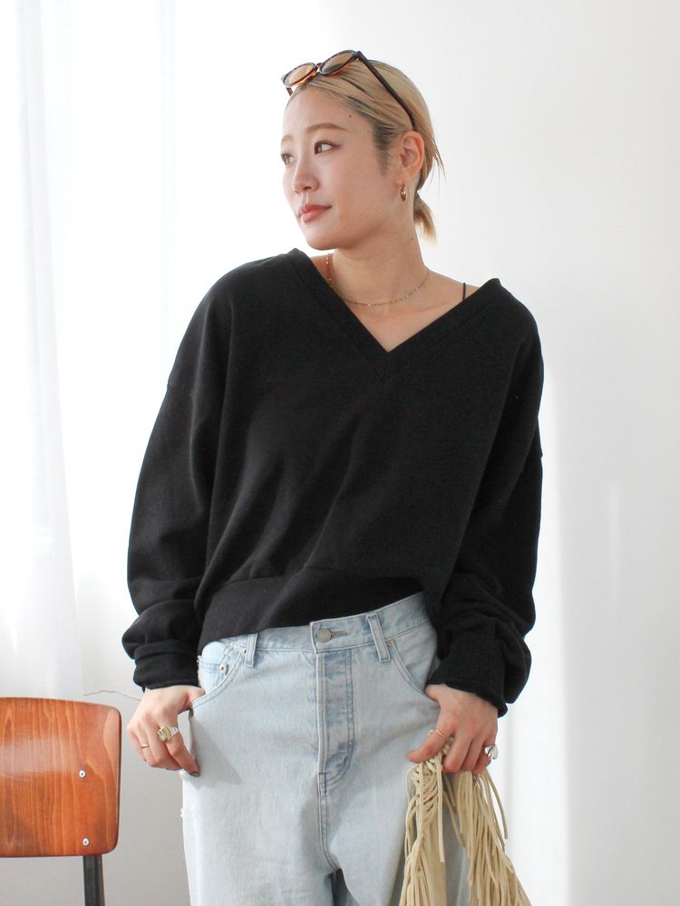 カジュアルなアイテムながらも、開きすぎないVラインで女性らしい印象に仕上げました。