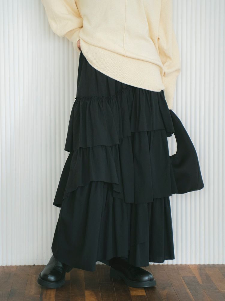 ミニボトムとの相性はもちろん、あえてフルレングスのスカートにあわせるのもおすすめです。