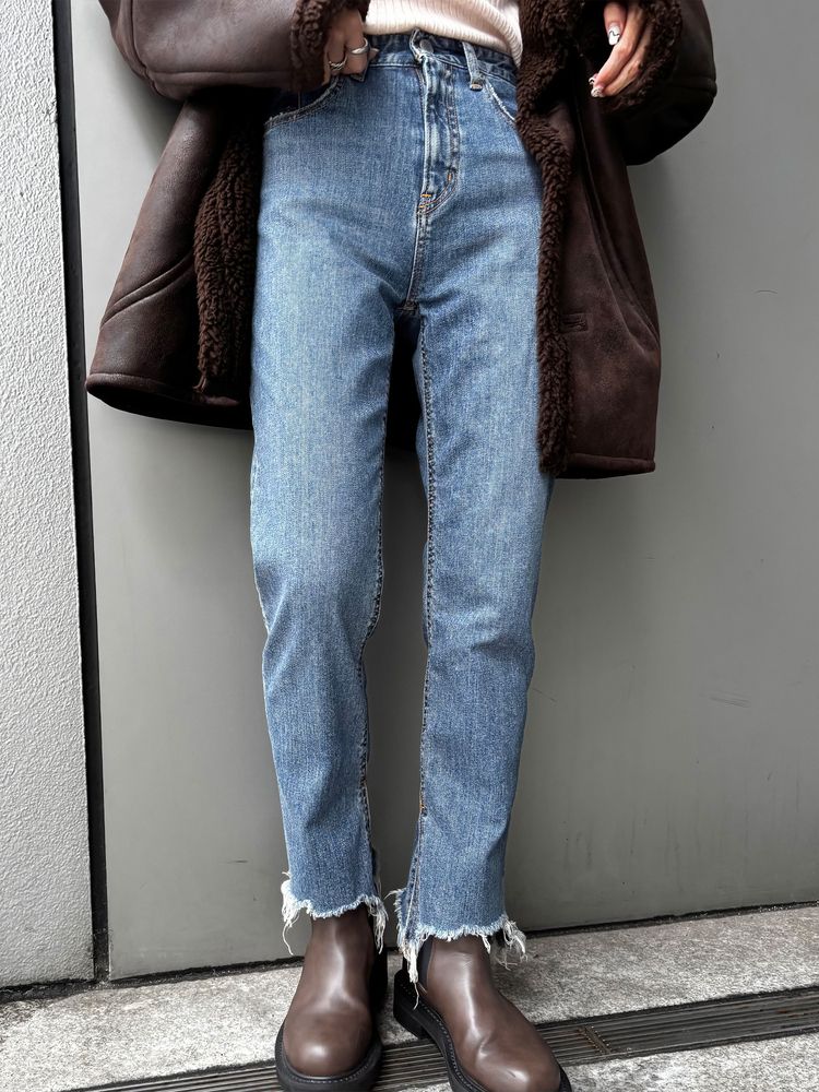 ヘムのクラッシュデザインがポイントのテーパードデニム