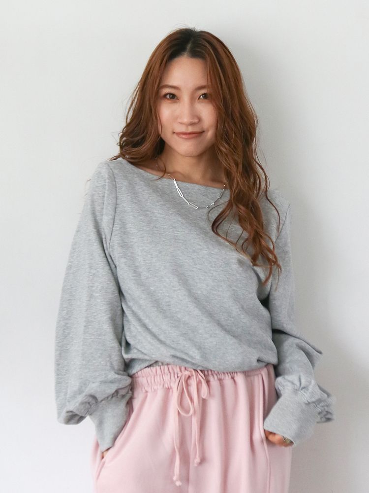 オフショルとしてもボートネックとしても着用でき、袖のたっぷりとしたボリューム感がポイントです。