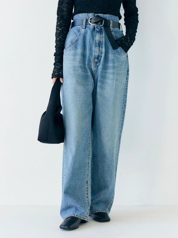 ビッグサイジングのデニムをベルトでぎゅっと締めてメンズライクなシルエットで履けるデザインデニム