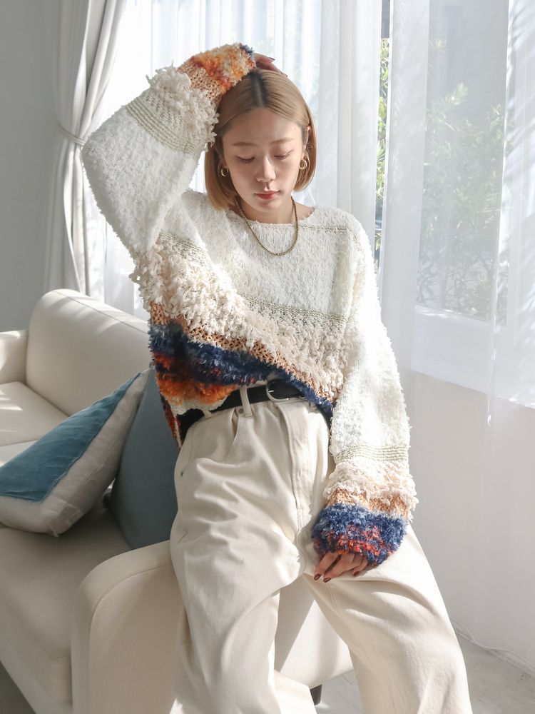 凹凸感のある糸やラメ糸、グラデーションカラーの糸などをランダムに様々な編み地で表現し、