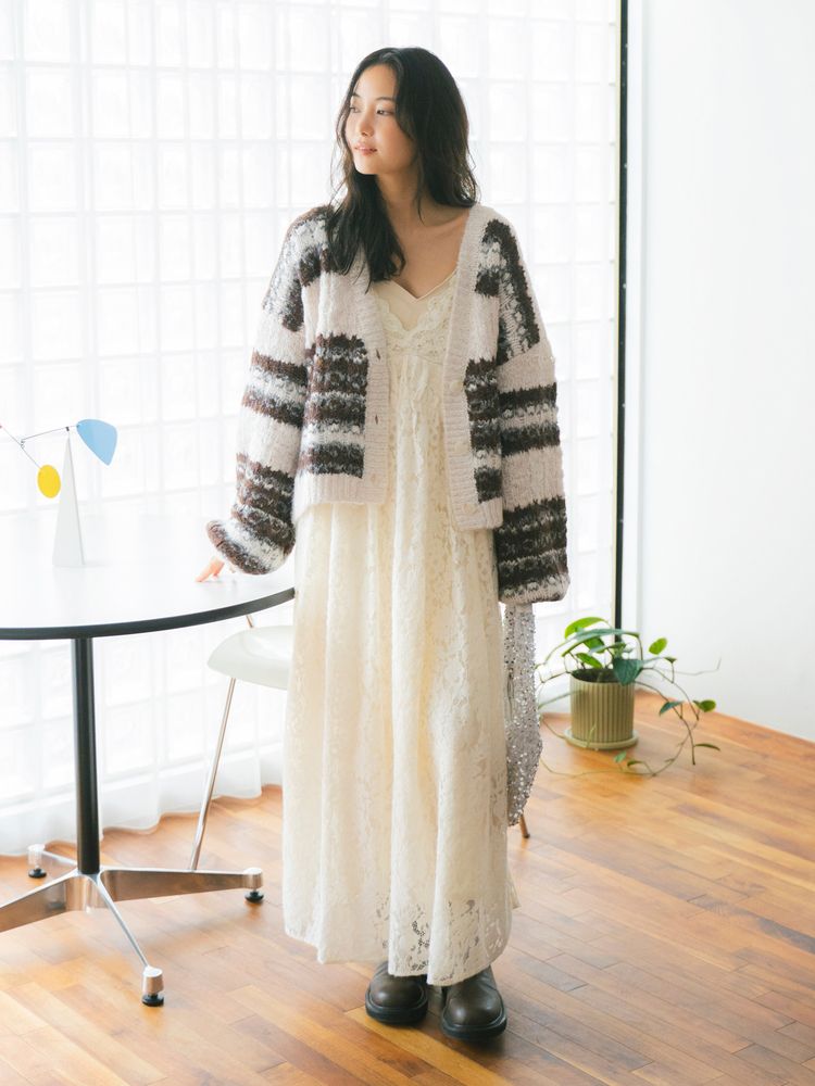 胸元にバテンレース、スカート部分に起毛レース生地を使用した、異素材コンビのデザインワンピース